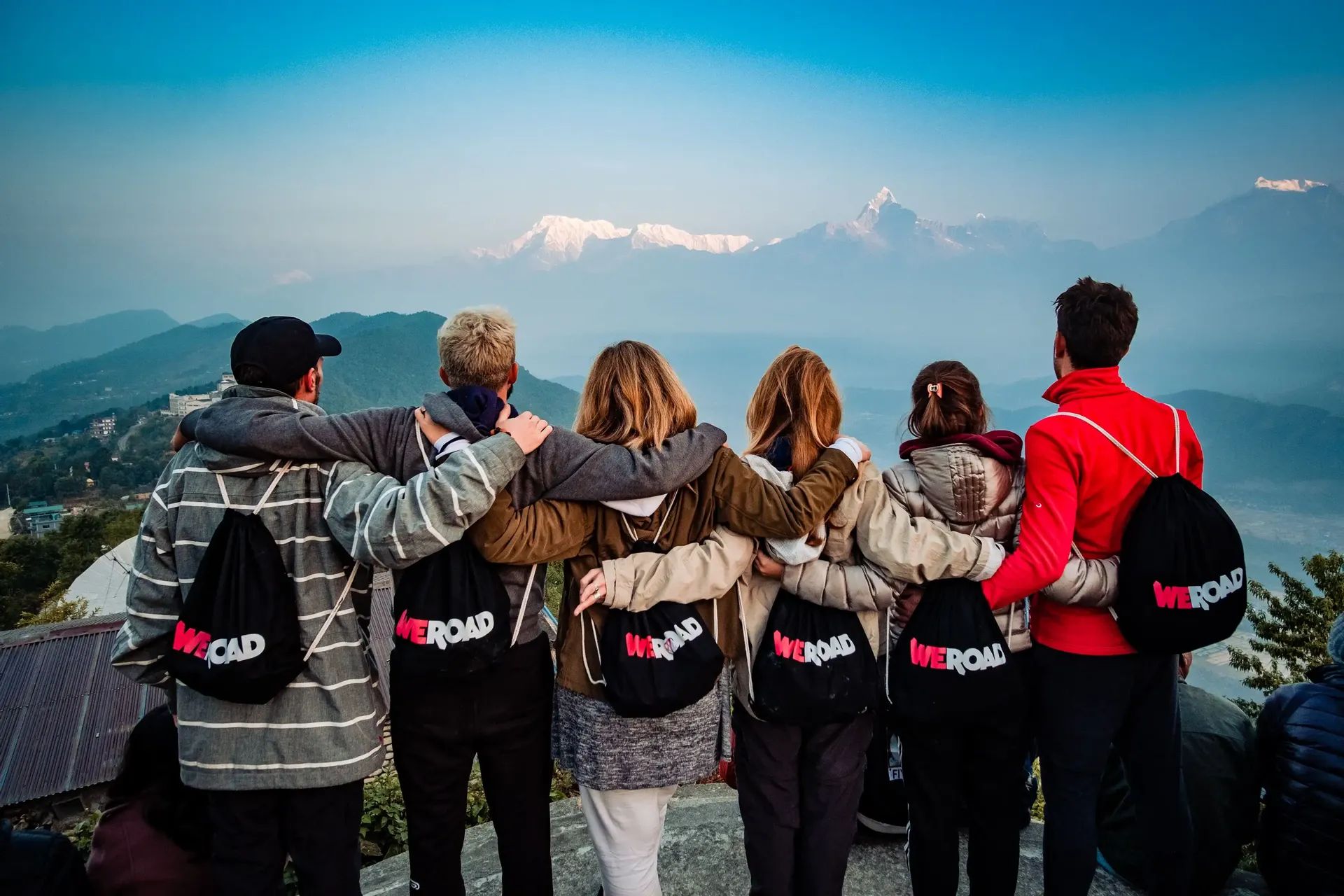 Scatti in cui sono visibili zaini WeRoad, badge coordinatore o t-shirt