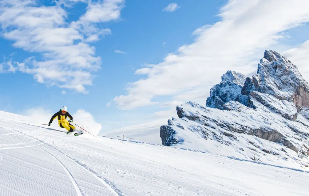 Uno sciatore in tuta gialla e nera scende una pista innevata, con cime montuose frastagliate sullo sfondo sotto un cielo parzialmente nuvoloso.